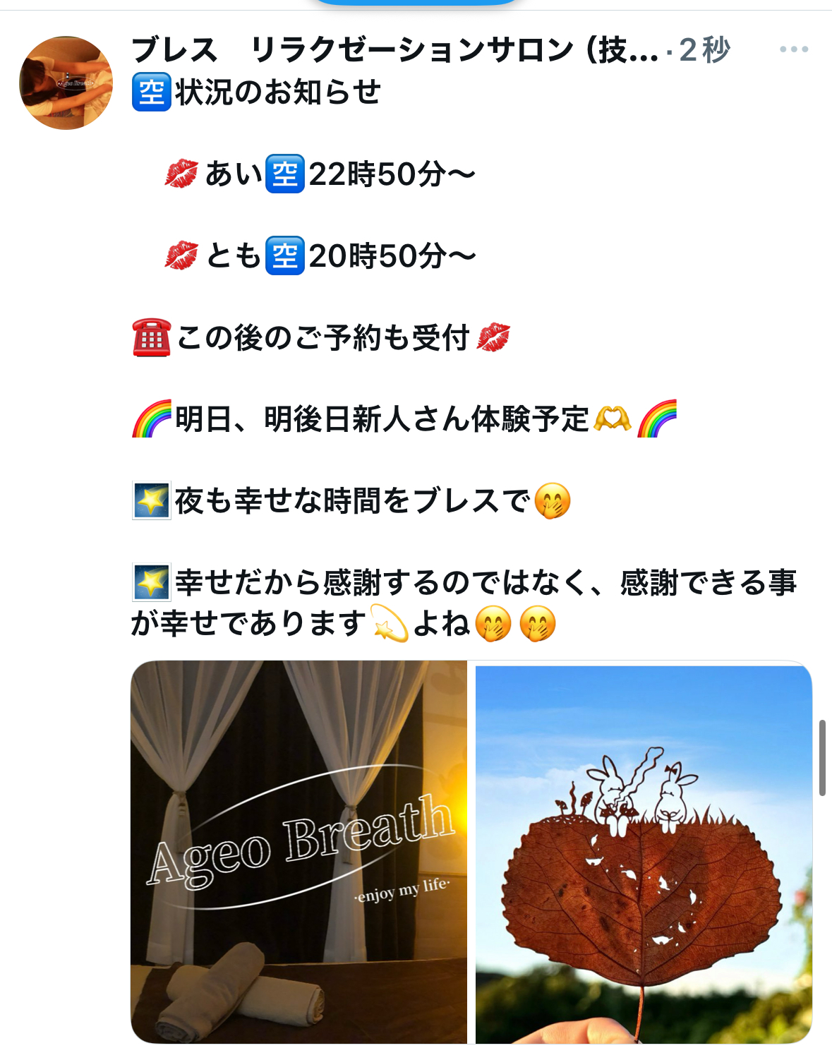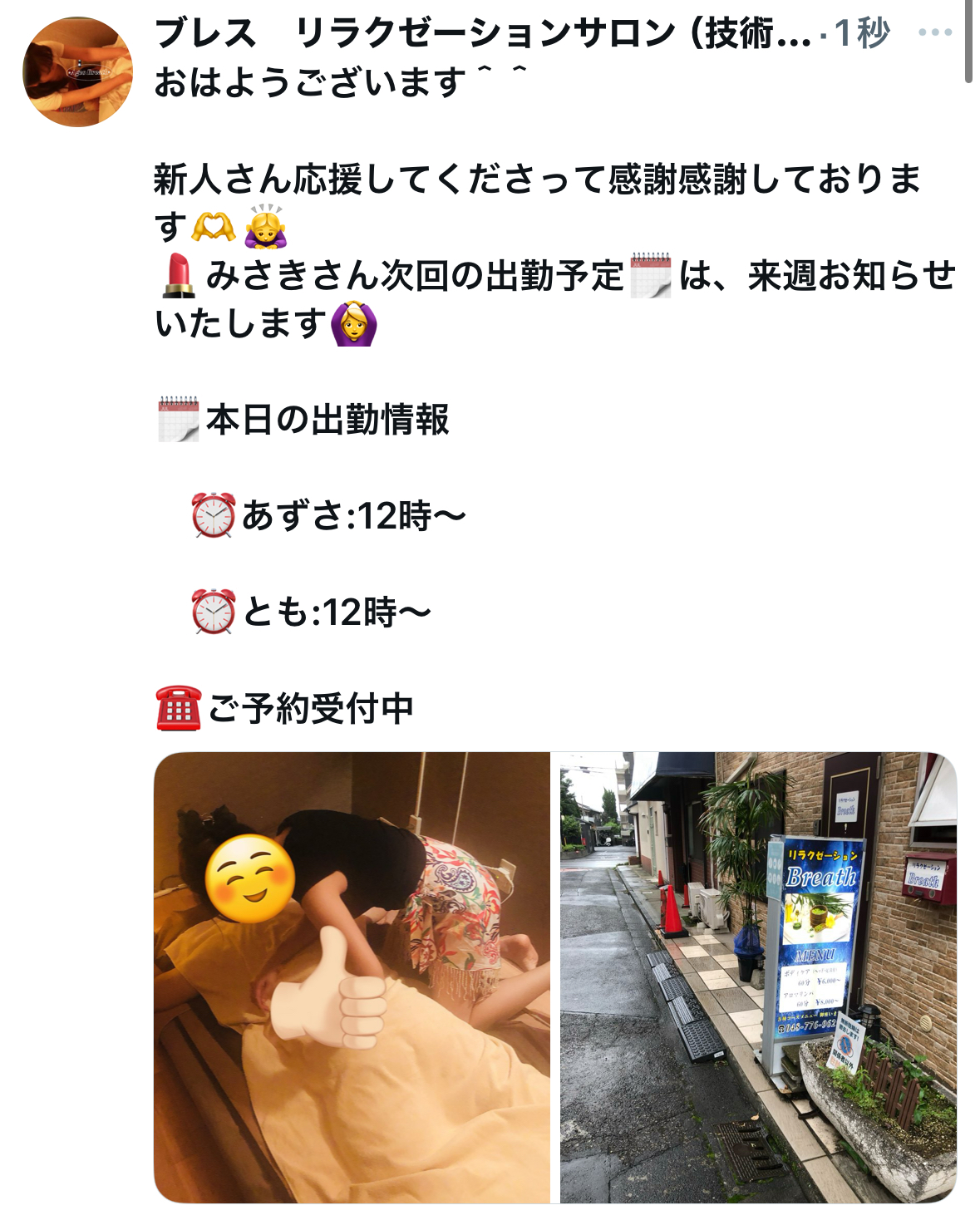 おはようございます^^寒い日はブレスの心を込めたマッサージで、心身共にポカポカに癒されてください^^