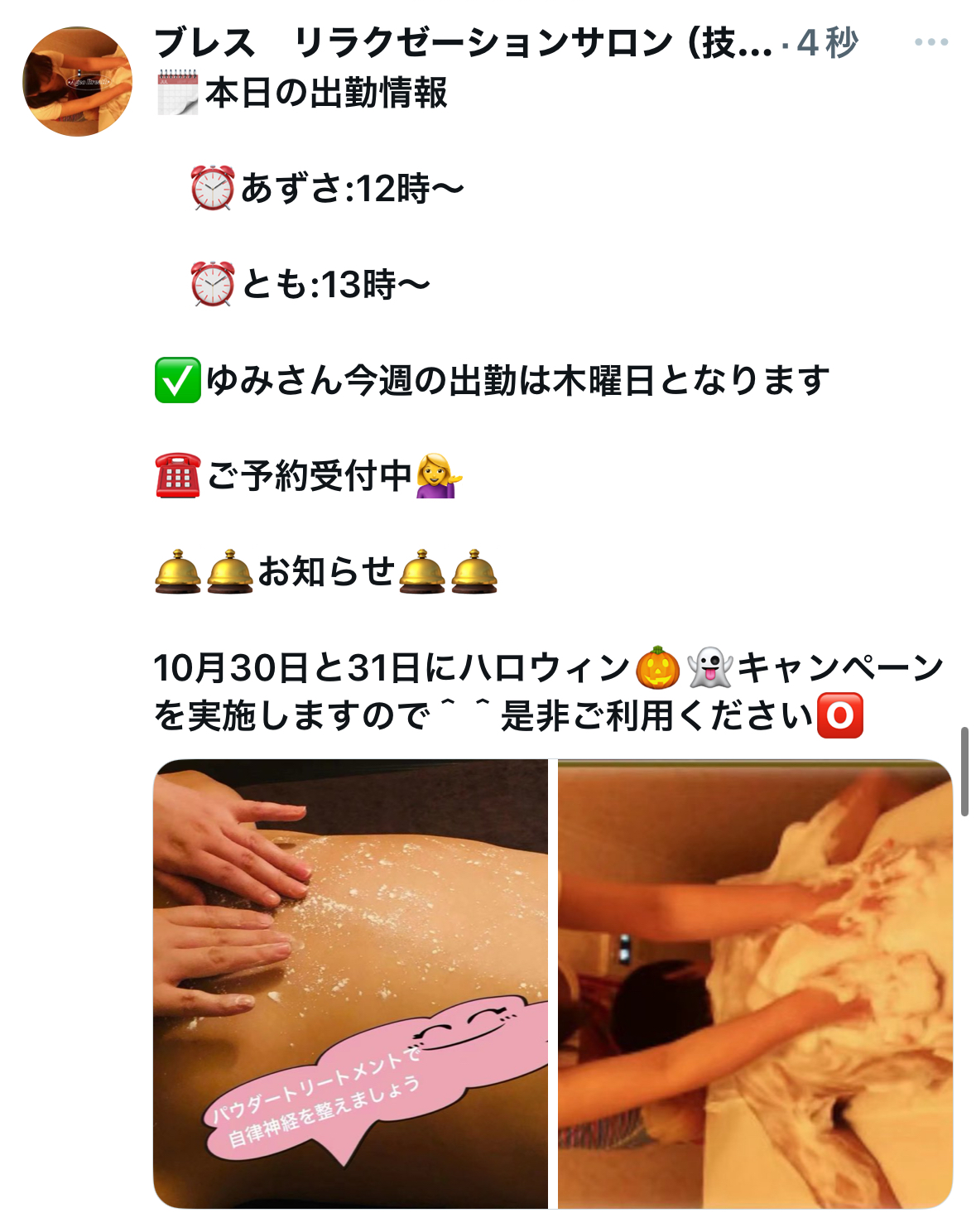 おはようございます^^ハッピーハロウィン(^^)本日も店内を暖かくしてますので^^心地良く施術を受けられます♪♪♪当日ご予約はお早めにお願いします🤲