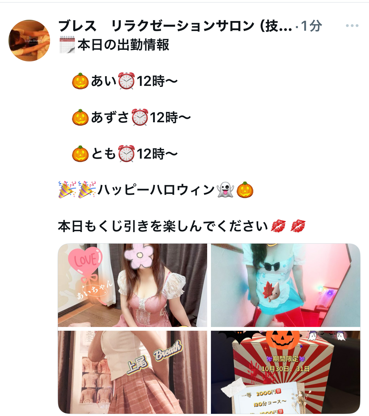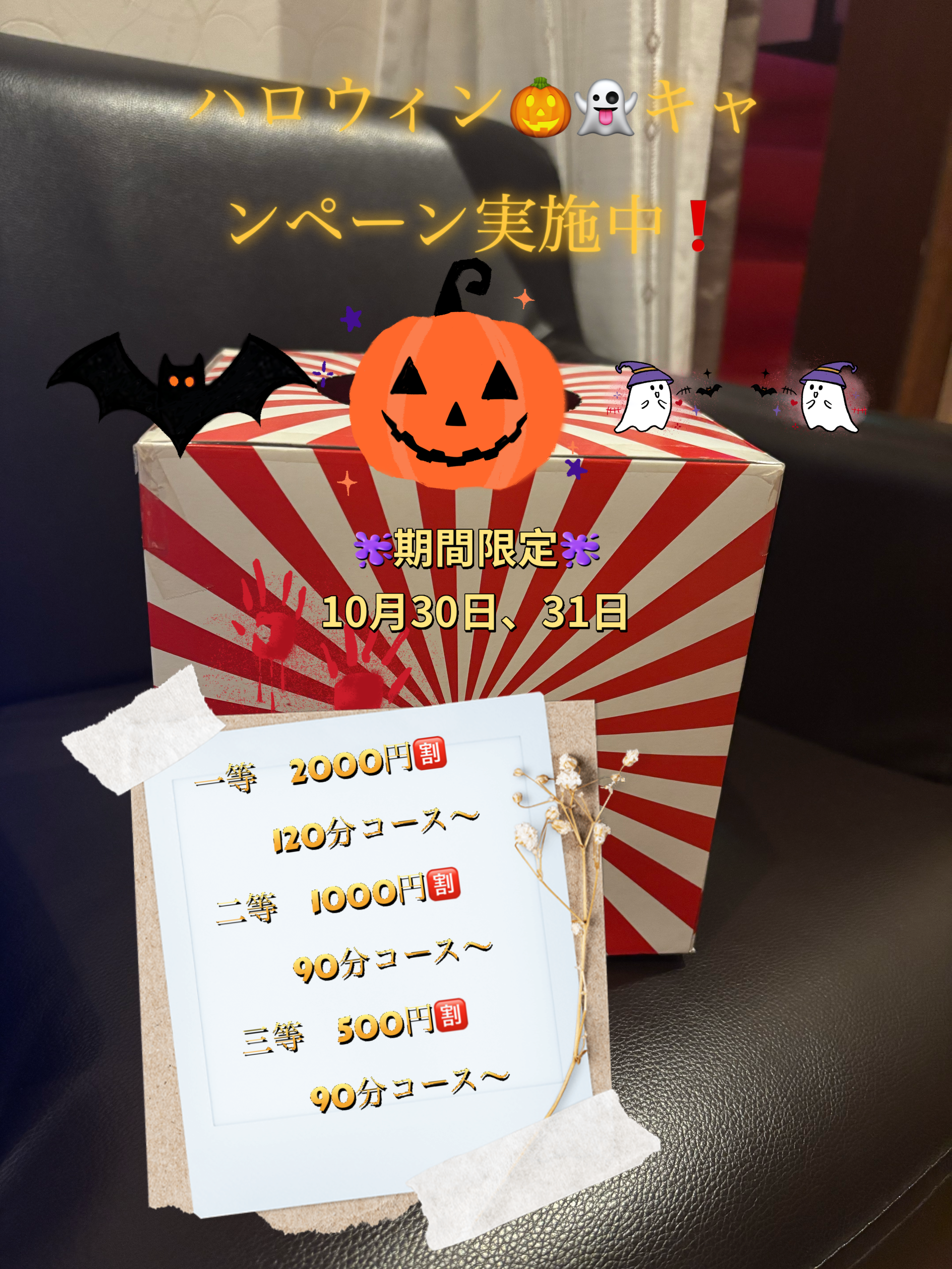 おはようございます^^日頃感謝の気持ちを込めて、本日から二日間限定でくじ引きを実施しております♪ 本日の出勤スタッフ あい、ゆみ、あずさハズレがないですので^^是非ブレスでハロウィンを楽しんでください^^