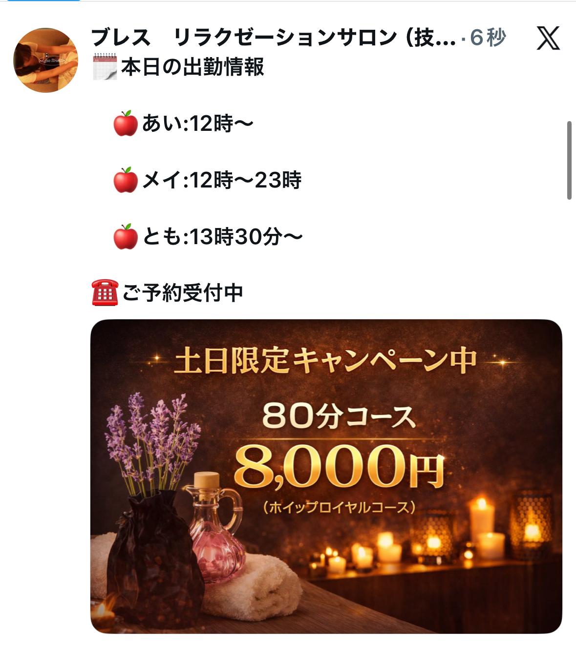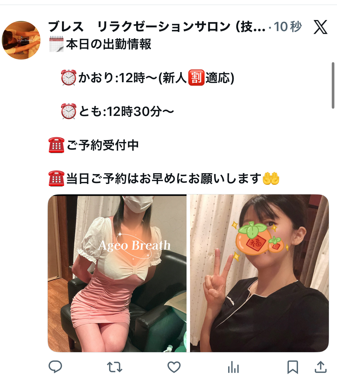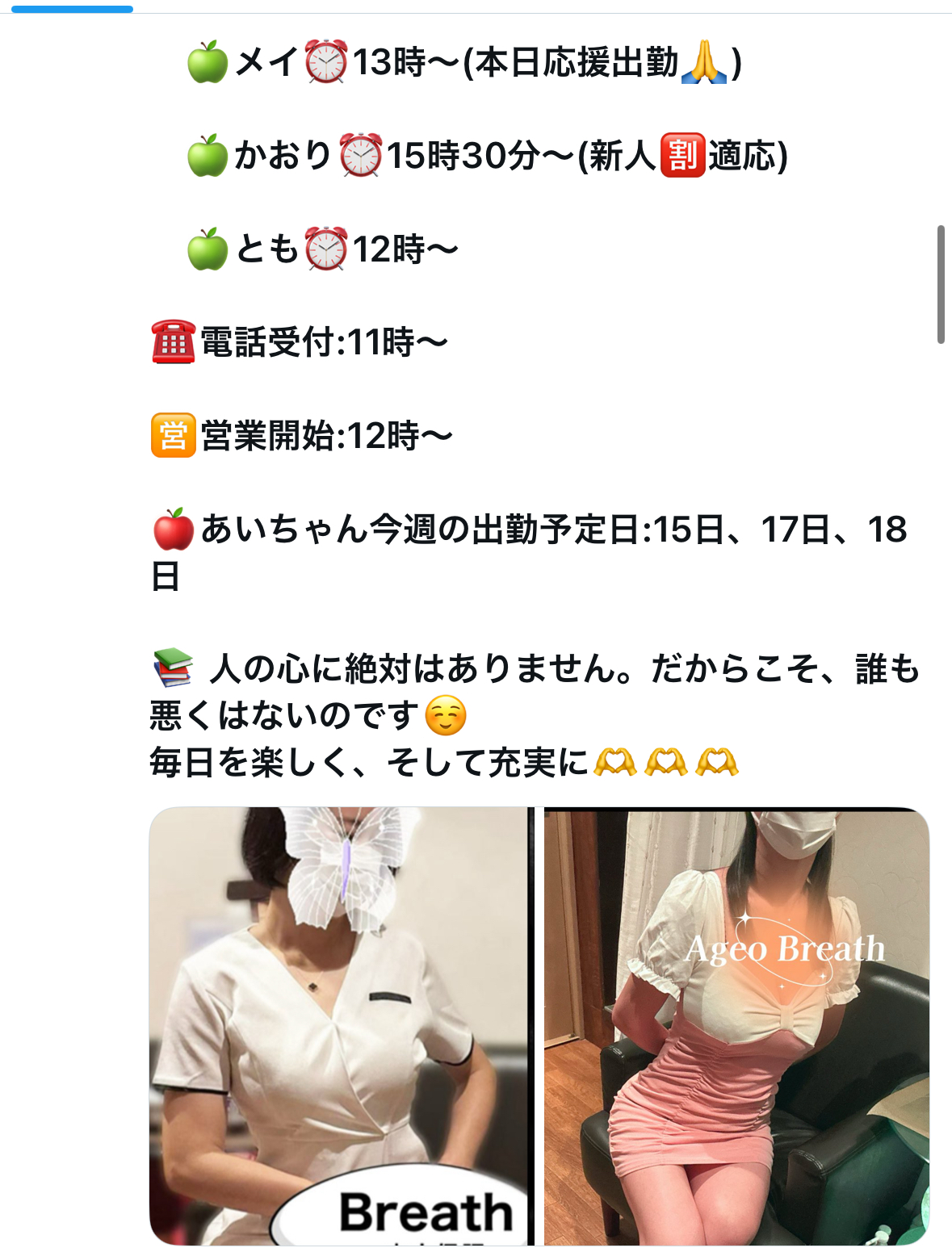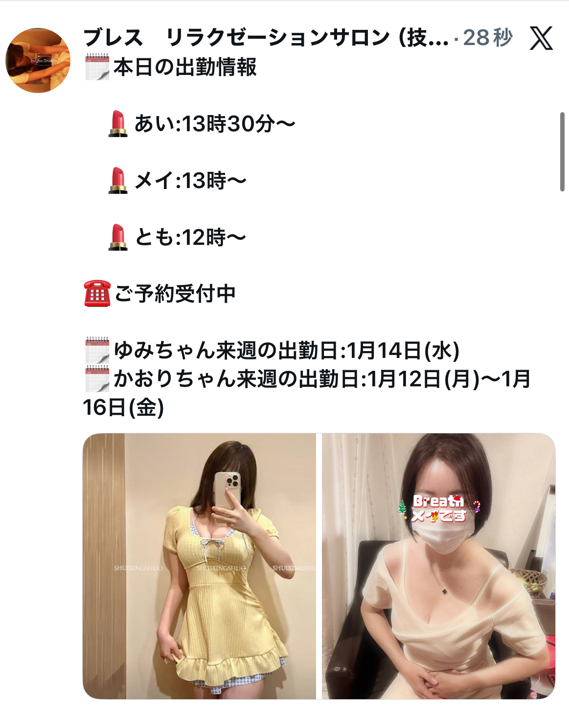 本日の出勤スタッフ かおり:12時から 美人癒し系(新人割適応) あい:12時から 可愛い癒し系 とも:13時から お姉さん系