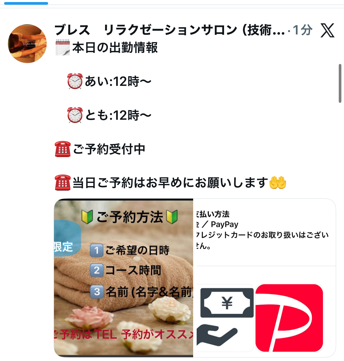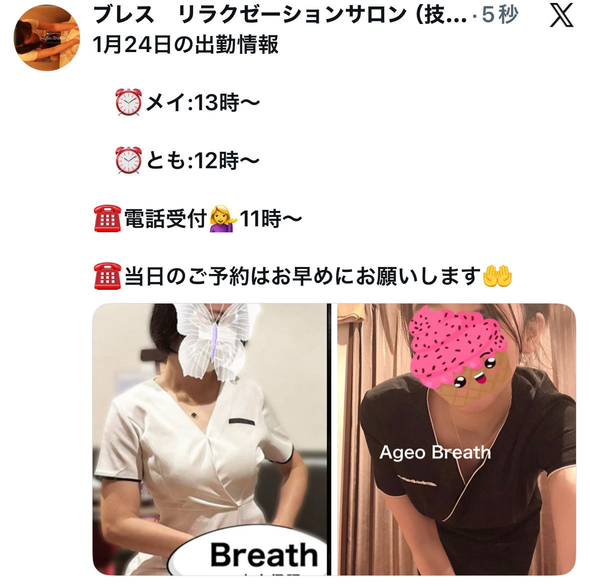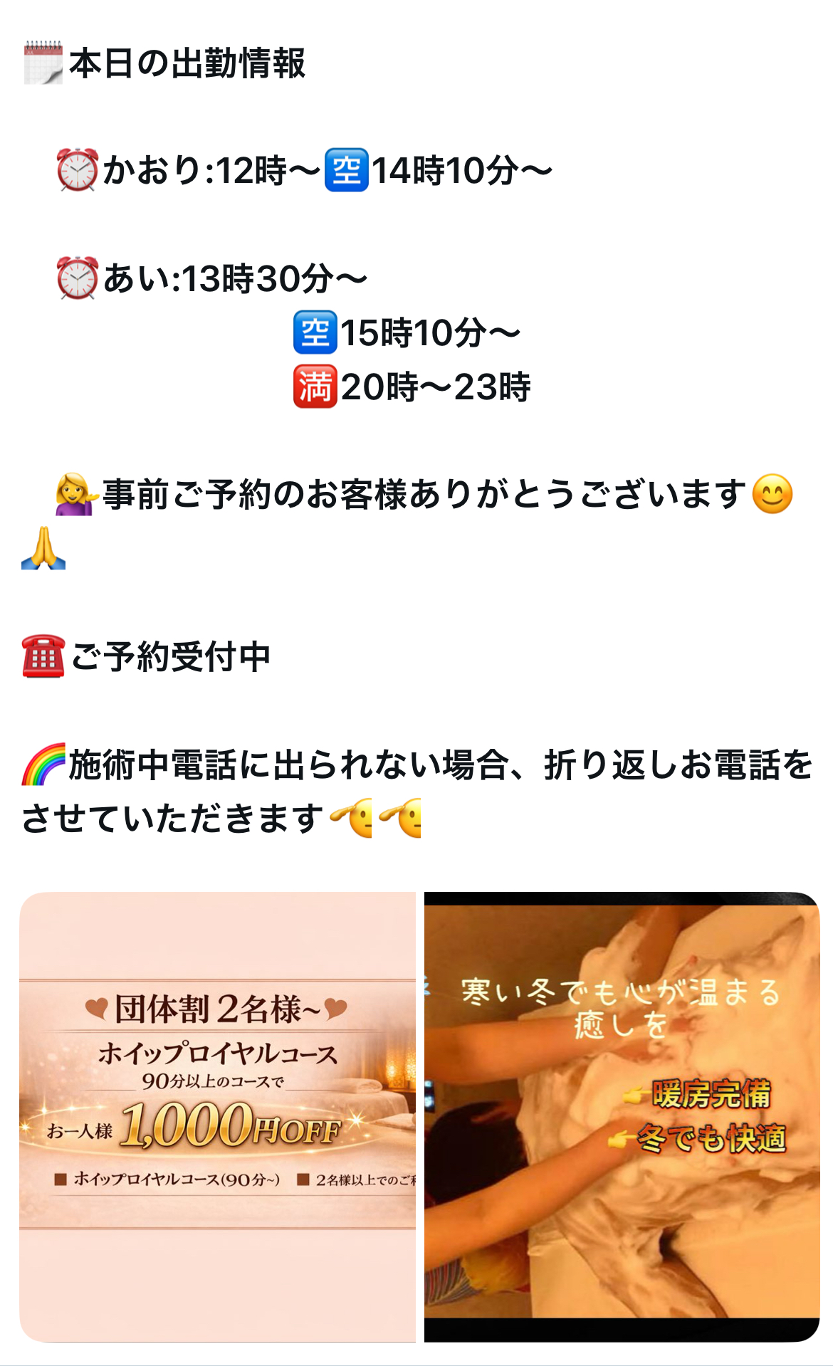 本日もブレスをご利用いただきまして、誠にありがとうございます^^ かおり:空き枠 24時45分から ラスト一名様 あい :空き枠 23時50分から ラスト一名様夜は空き枠が少ないので、ご予約はお早めお願いします^^仕事中早急な対応ができかねますので、ご了承ください。