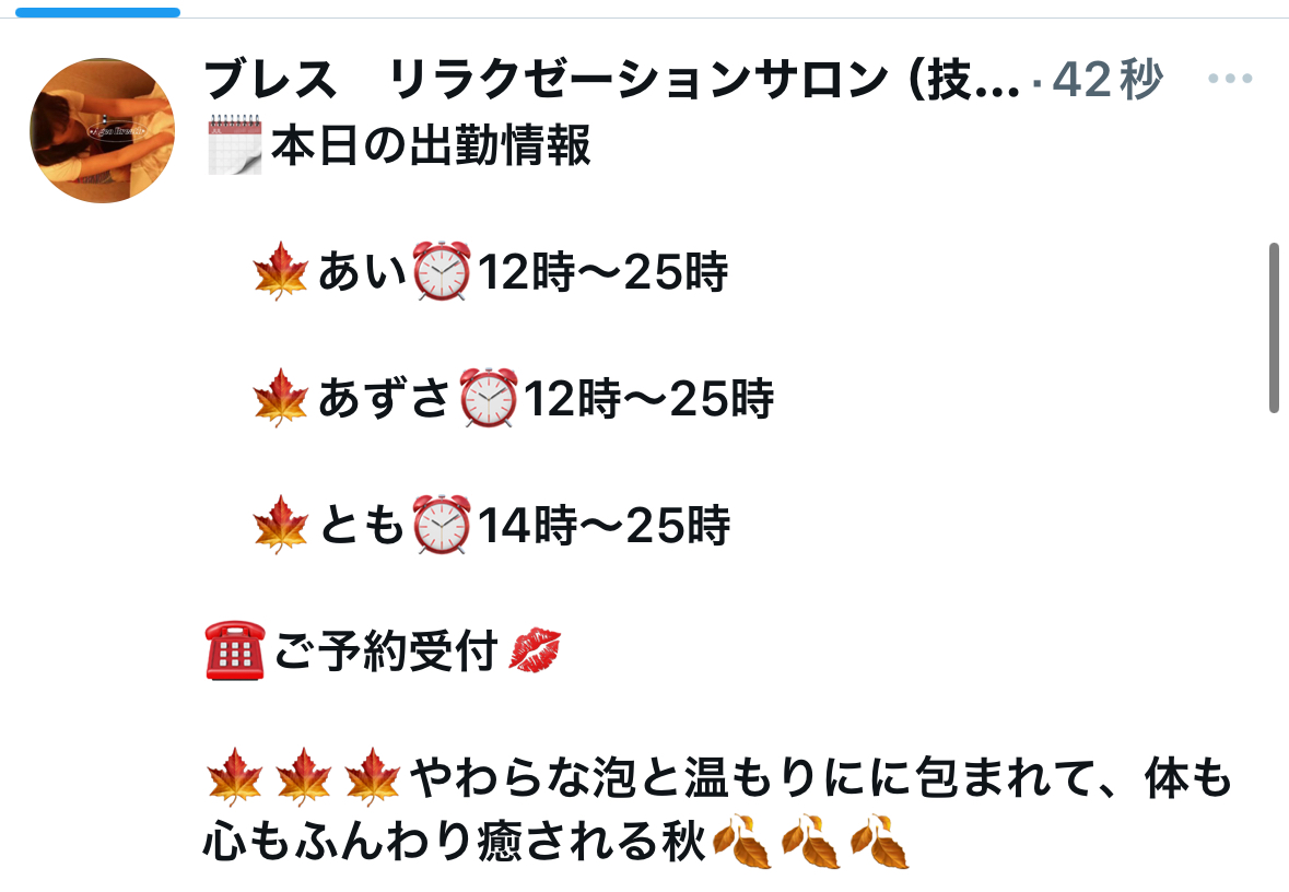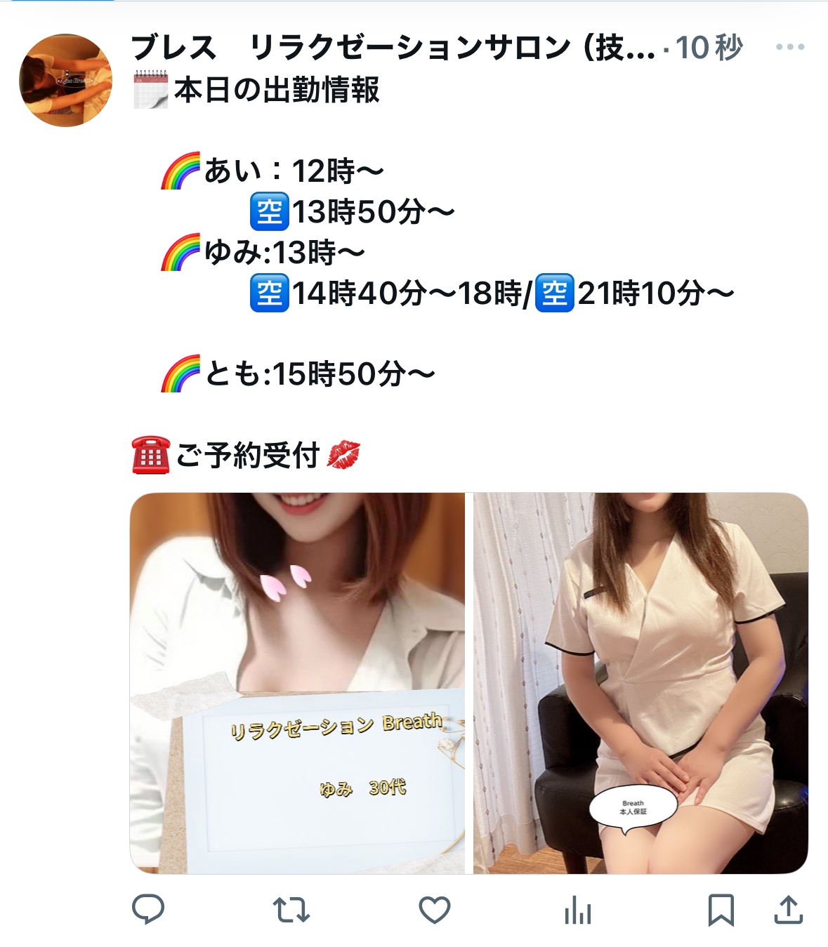本日もブレスをご利用していただきまして、誠にありがとうございます^^ あずさちゃん:空き枠22時10分から あいちゃん:空き枠23時20分から