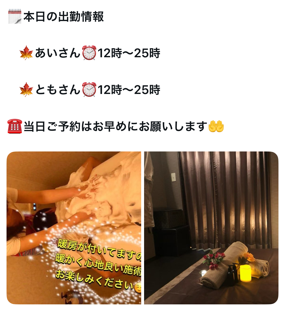 本格アカスリや本格マッサージで日頃の疲労を解消してください^^幸せの土台は健康ですから^^あいちゃん:空き 17時15分からあずさちゃん:空き 17時15分からともちゃん:空き 18時40分から夜はまだまだ空き枠がございますので^^ご来店をお待ちしております♪