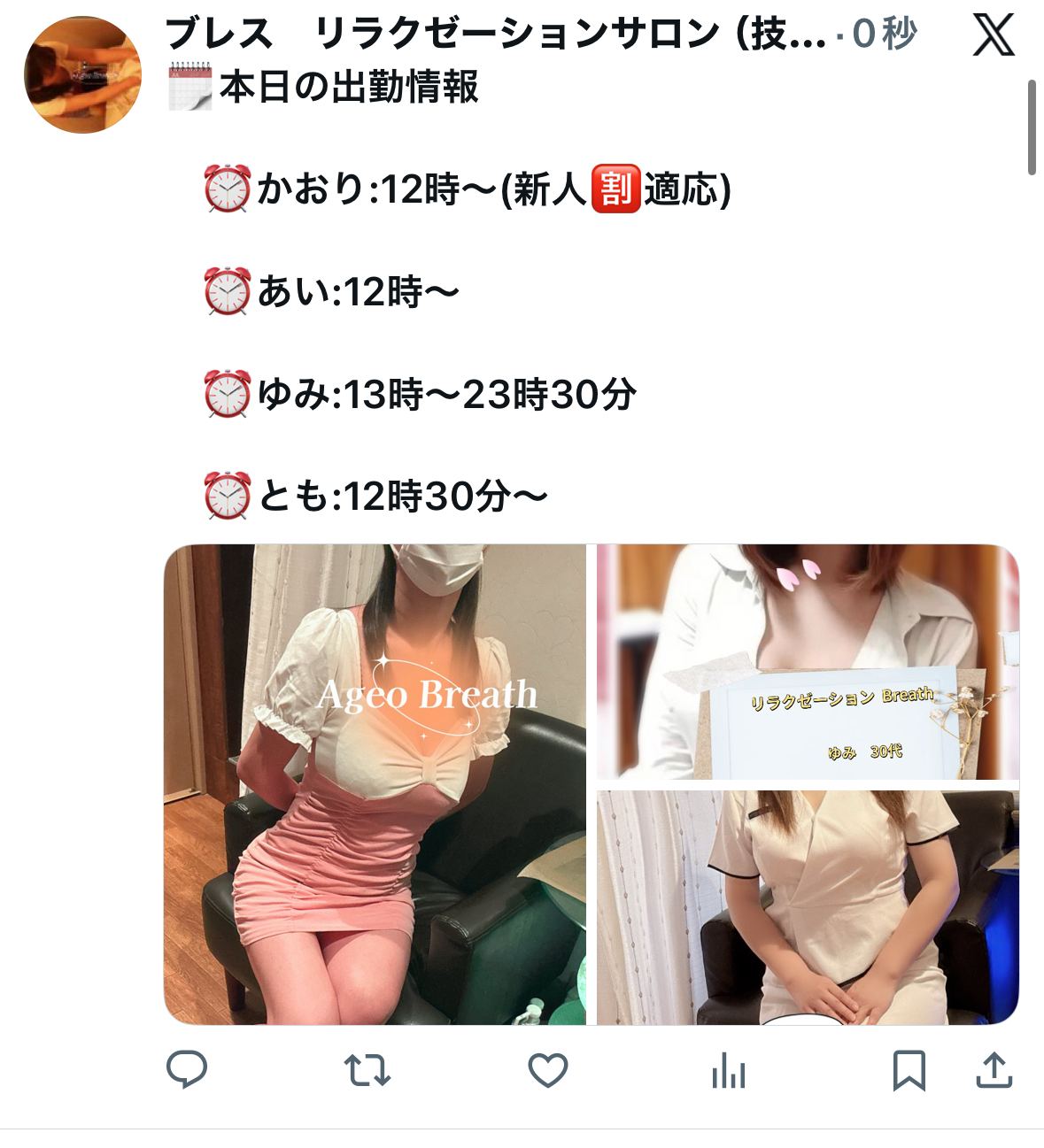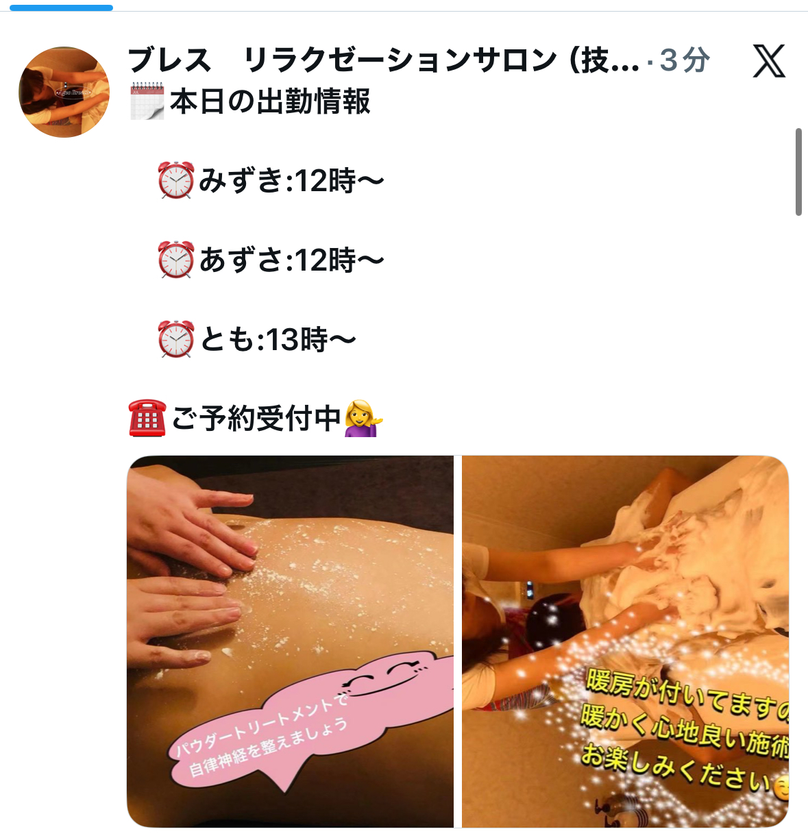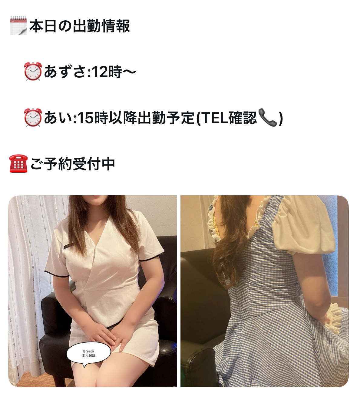 本日の出勤スタッフ あずさ、あい、ともご予約受付中^^