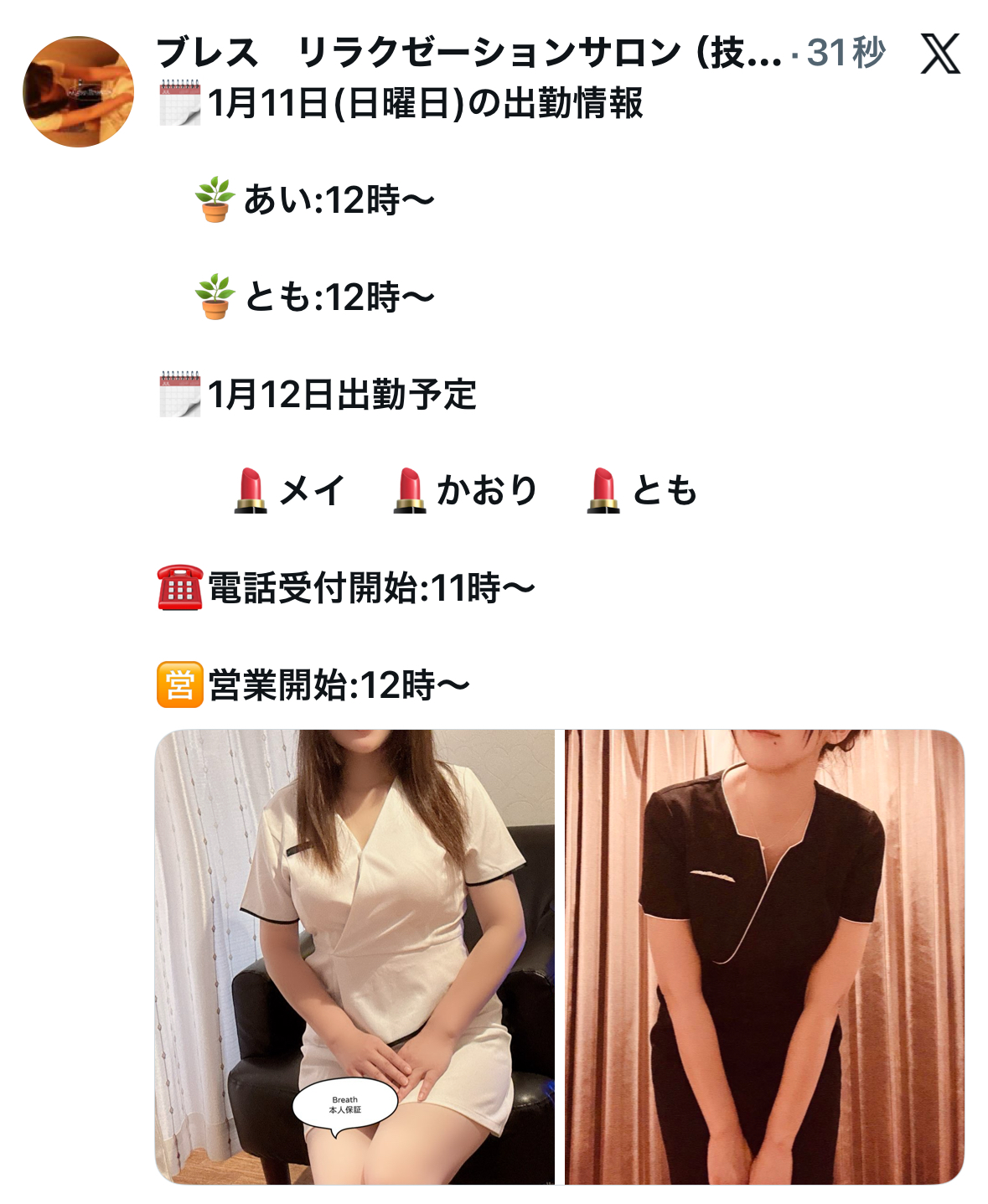 本日の出勤スタッフ かおり:12時から 美人癒し系(新人割適応) あい:12時から 可愛い癒し系 とも:13時から お姉さん系