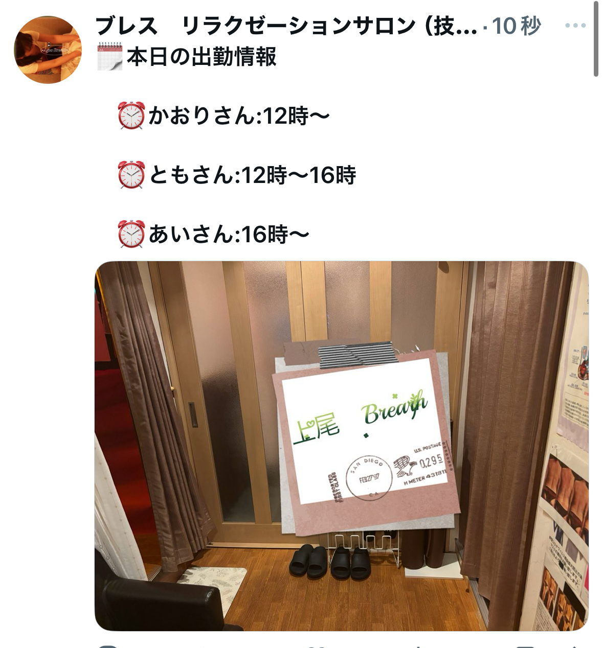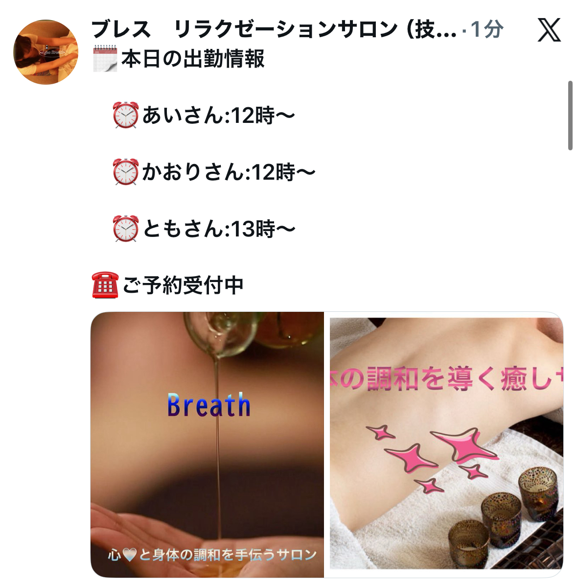 本日の出勤スタッフ かおりさん、あいさん、ともさん寒い日は ブレスで心身共に癒されてください♪ご案内状況など、xにてご確認ください^^
