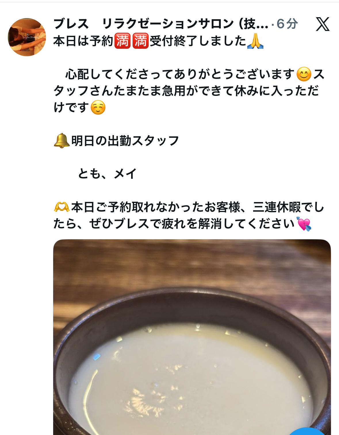 おはようございます^^ 本日の出勤スタッフ ともさん施術中は電話にすぐ対応できかねます。折り返し電話を差し上げますので、ご了承ください♪ 本日の空き枠:19時10分から2名様の空きがございます^^