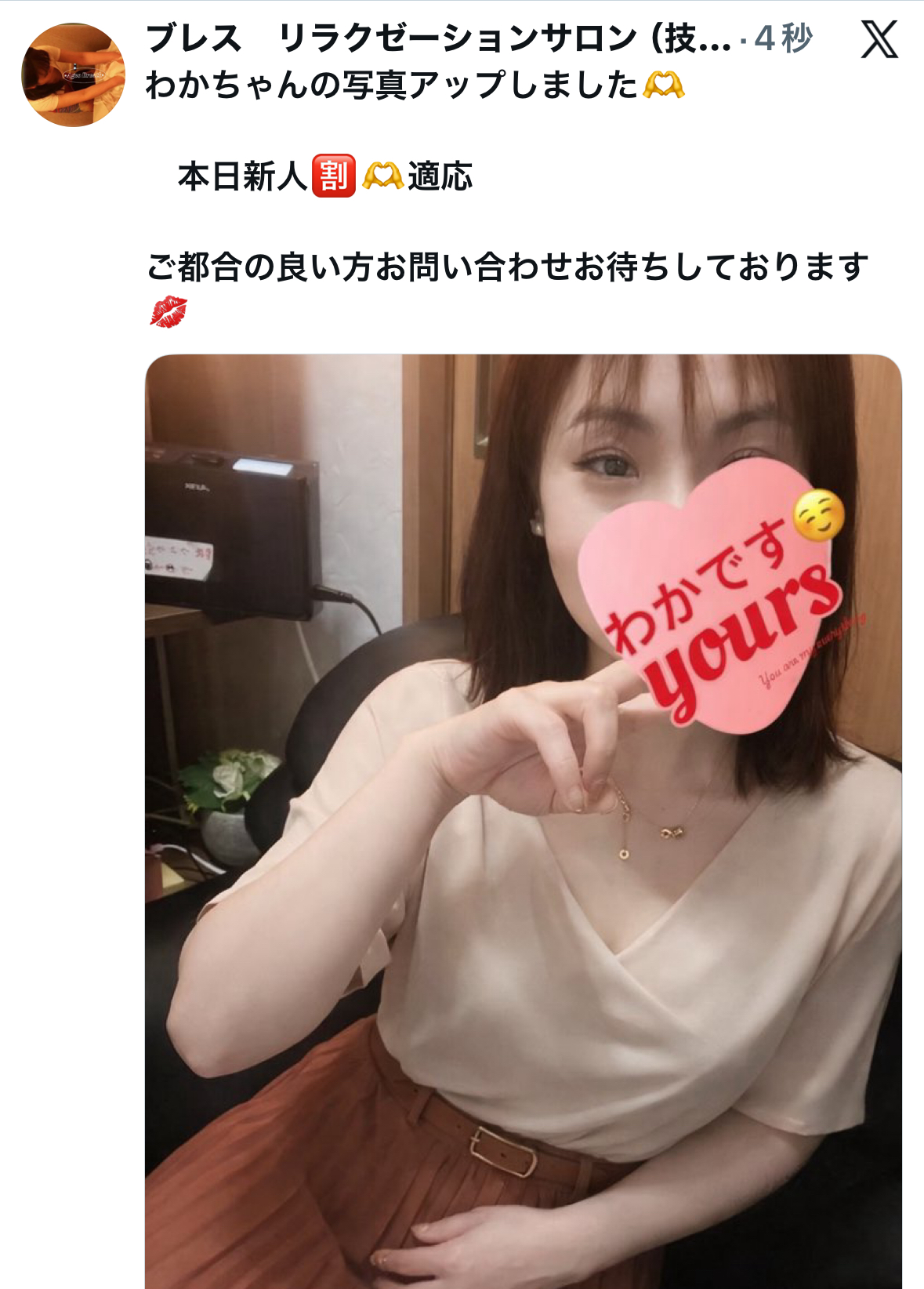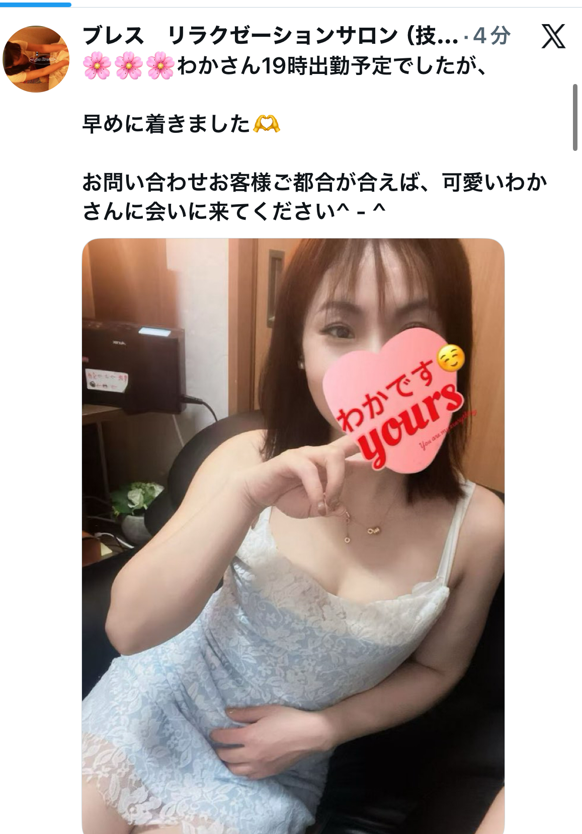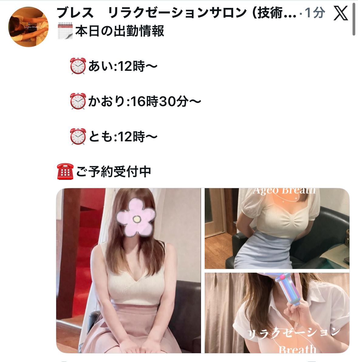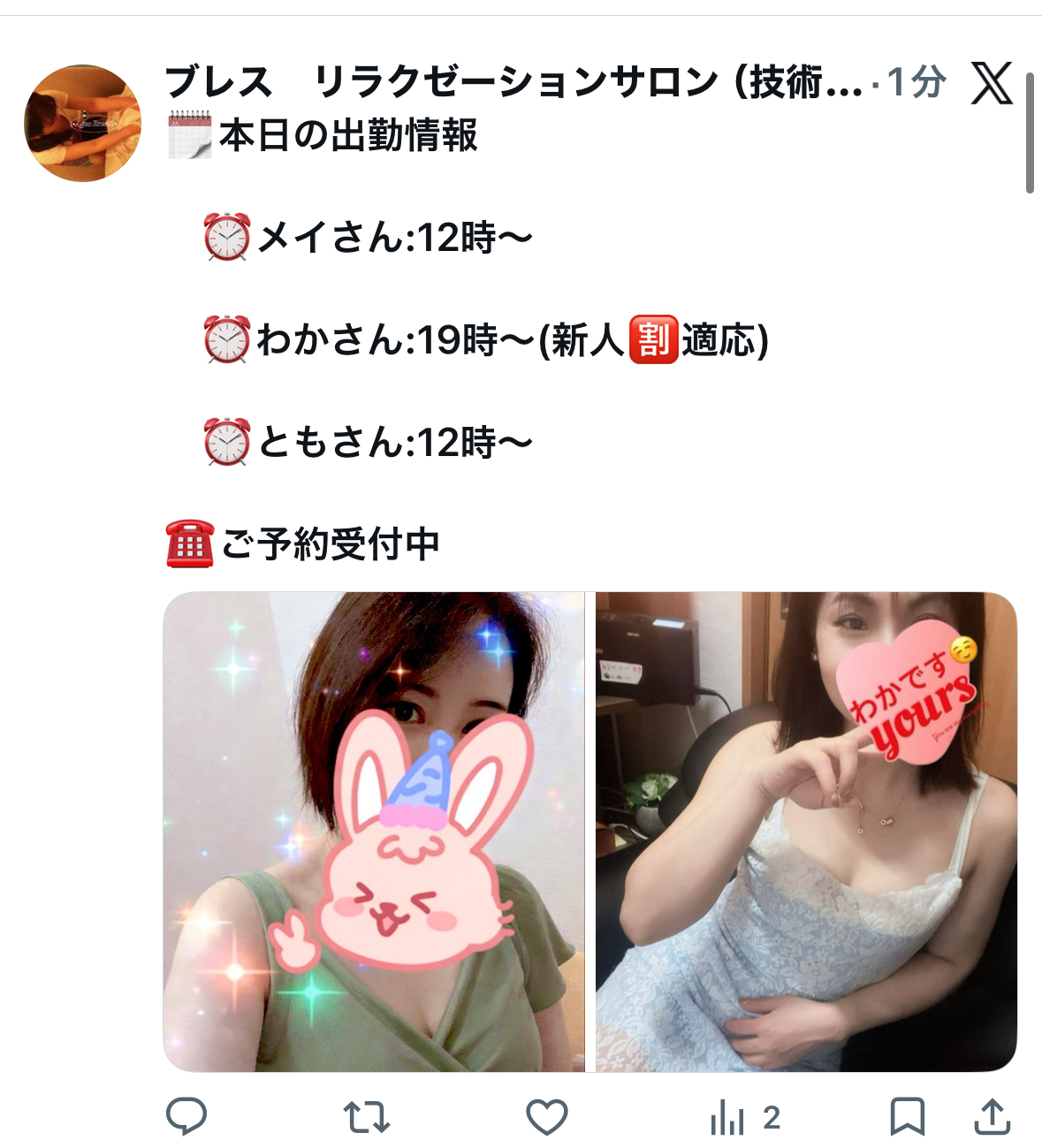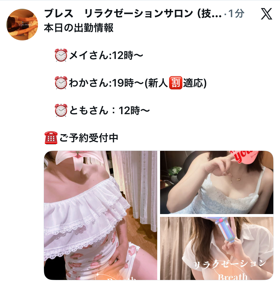 本日の出勤スタッフ あい、わか(新人割適応)、とも出勤詳細、ご案内状況などはXにてご確認ください!