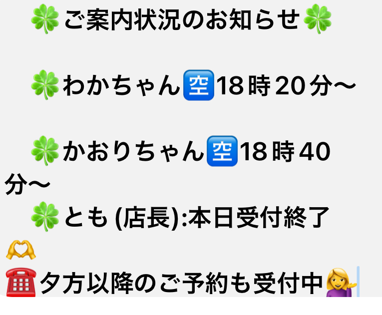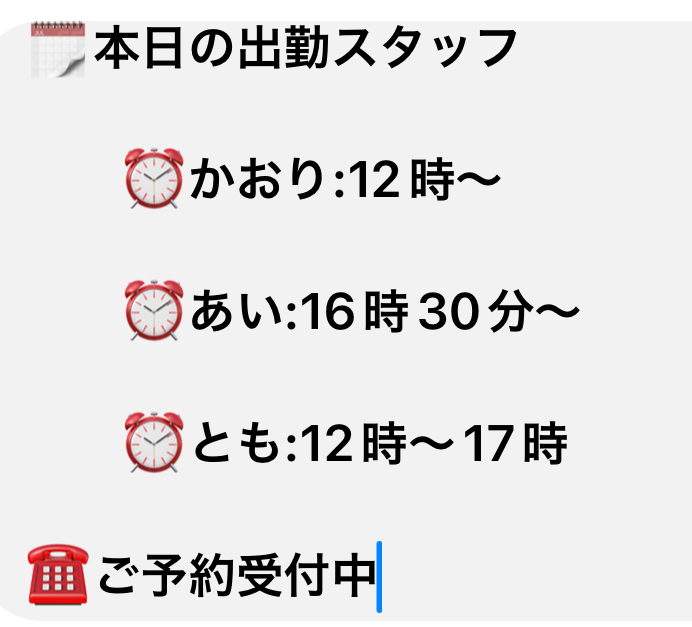本日もご新規様やリピー様のご来店ありがとうございます^^時間の合う方、ご予約はお早めにお願いします^^